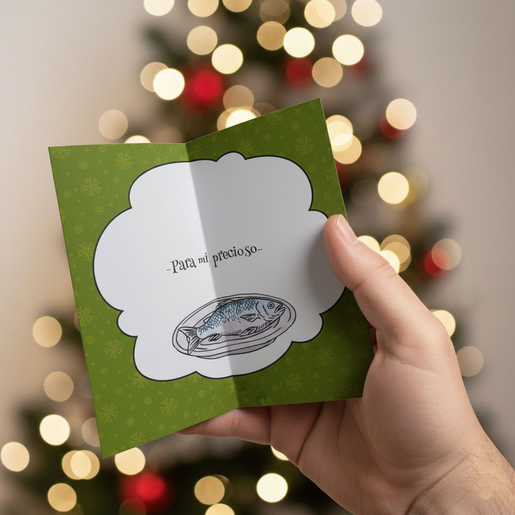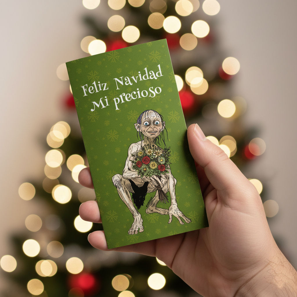 Nuestra tarjeta navideña protagonizada por Gollum, el icónico personaje de El Señor de los Anillos, es el detalle perfecto para fans del buen humor y la fantasía.